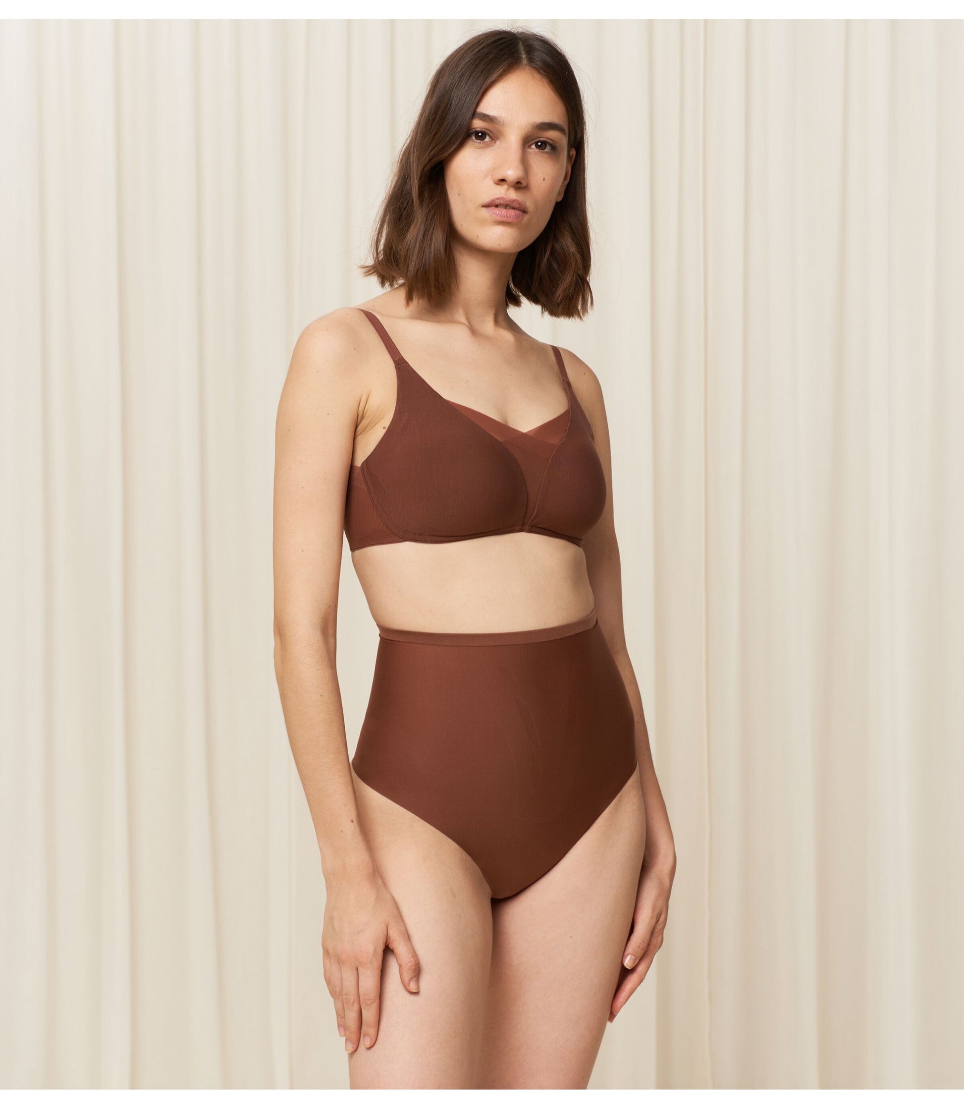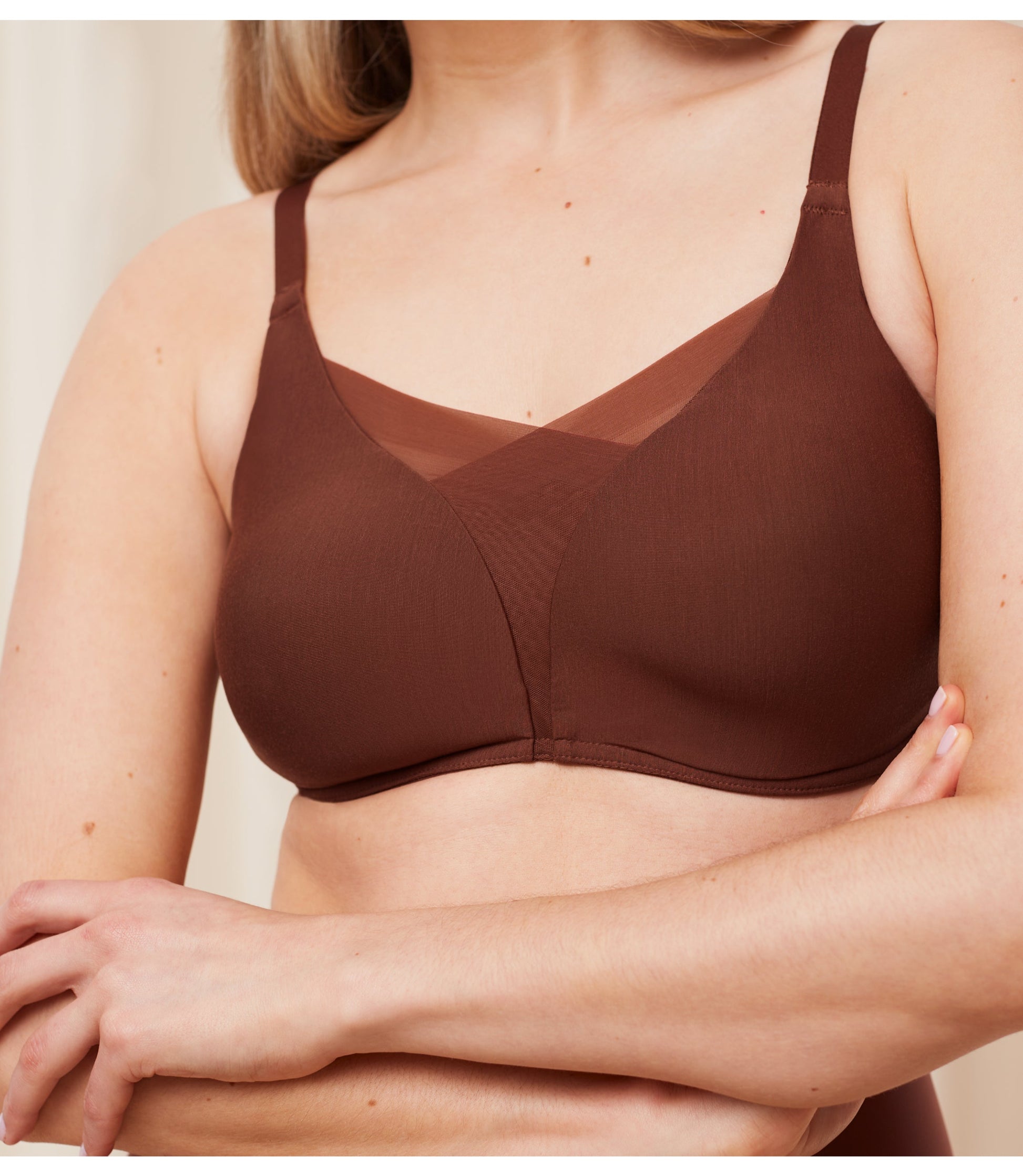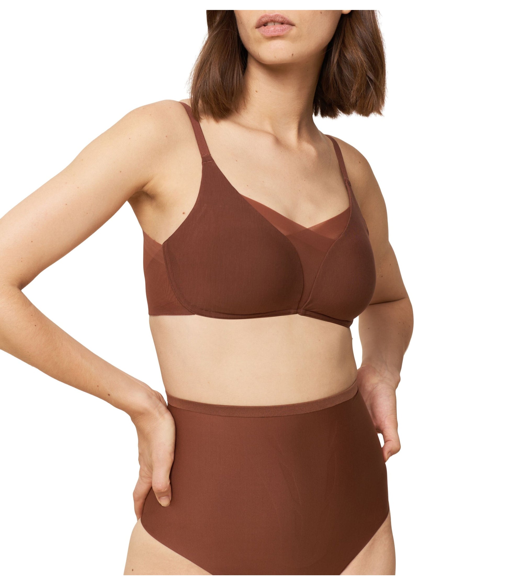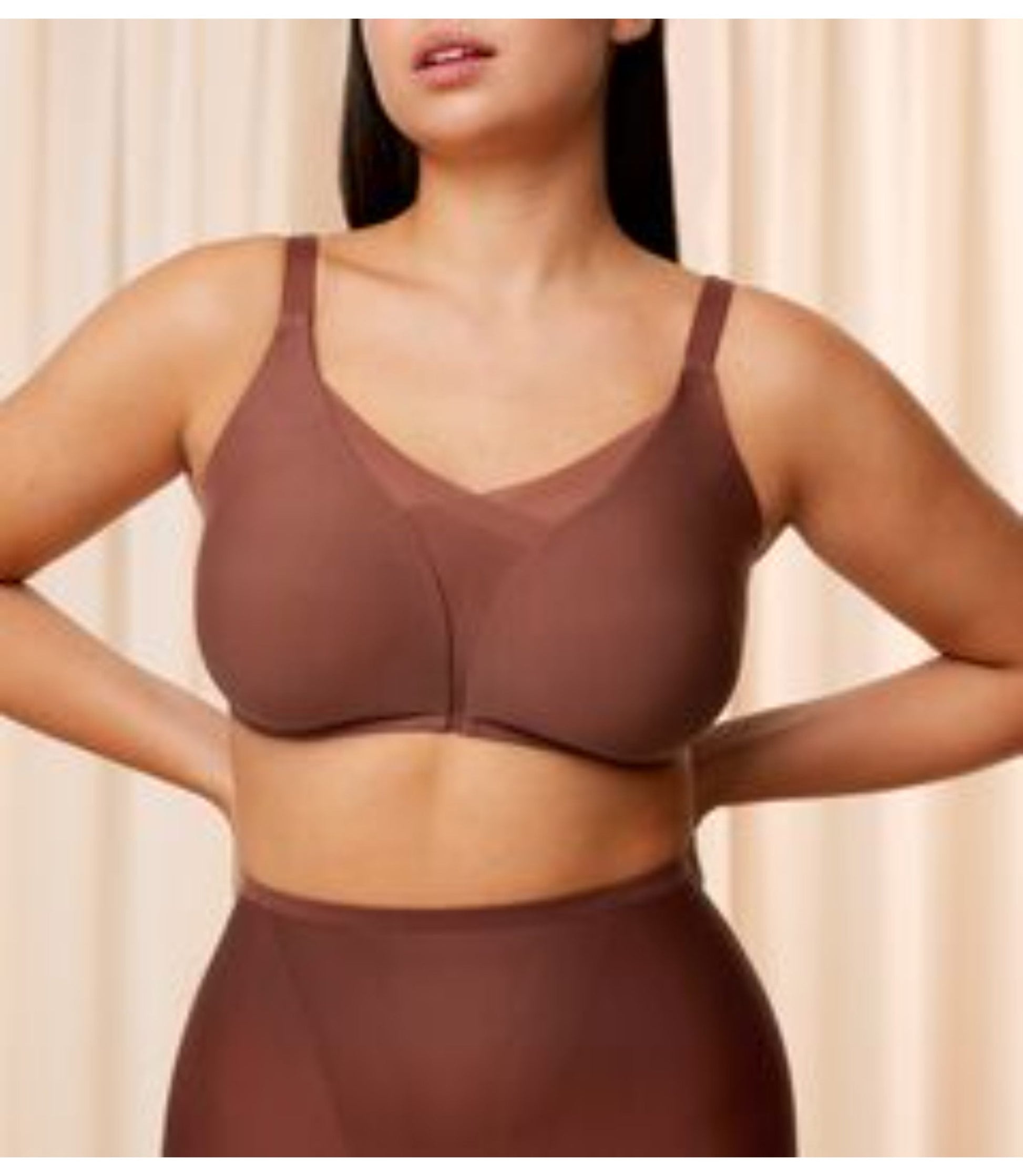 Material: 43% Polyamide, 25% Polyester, 23% Elastane, 9% Lyocell This smart bra perfectly balances sensuality and support. Lacy on the outside, hi-tech on the inside. A front mesh layer and smart 4D stretch foam cups support and smooth. With inclusive sizing from 1 to 5. handwash,do not iron,Do not bleach,Do not dry clean,Do not tumble dry