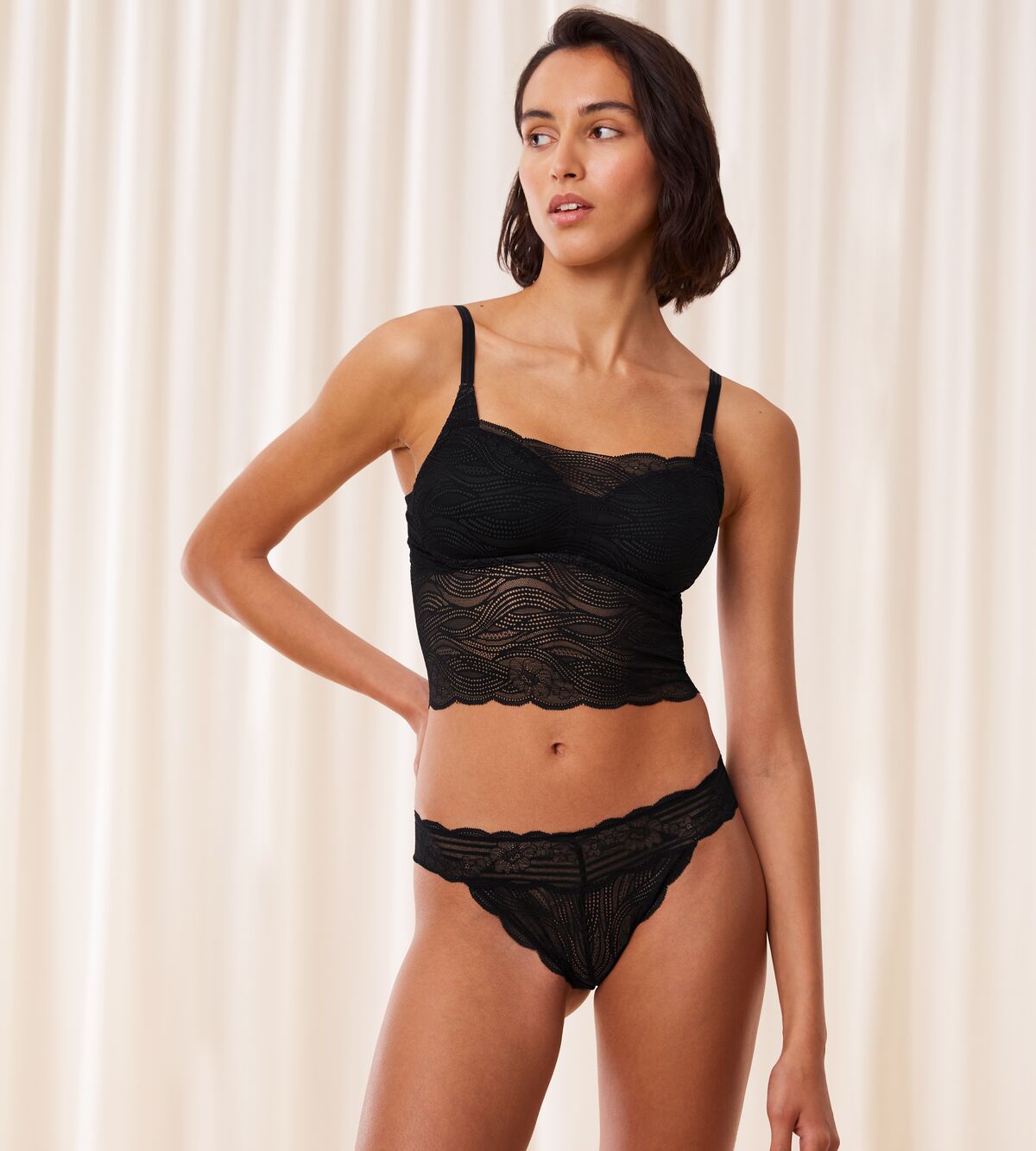 This Bustier is designed for sensual comfort. A discreet secret lift rejuvenates the look of the breasts. Made with partially recycled polyamide stretch lace that adapts to all shapes and sizes. Pull-on bustier with adjustable hook & eye closure