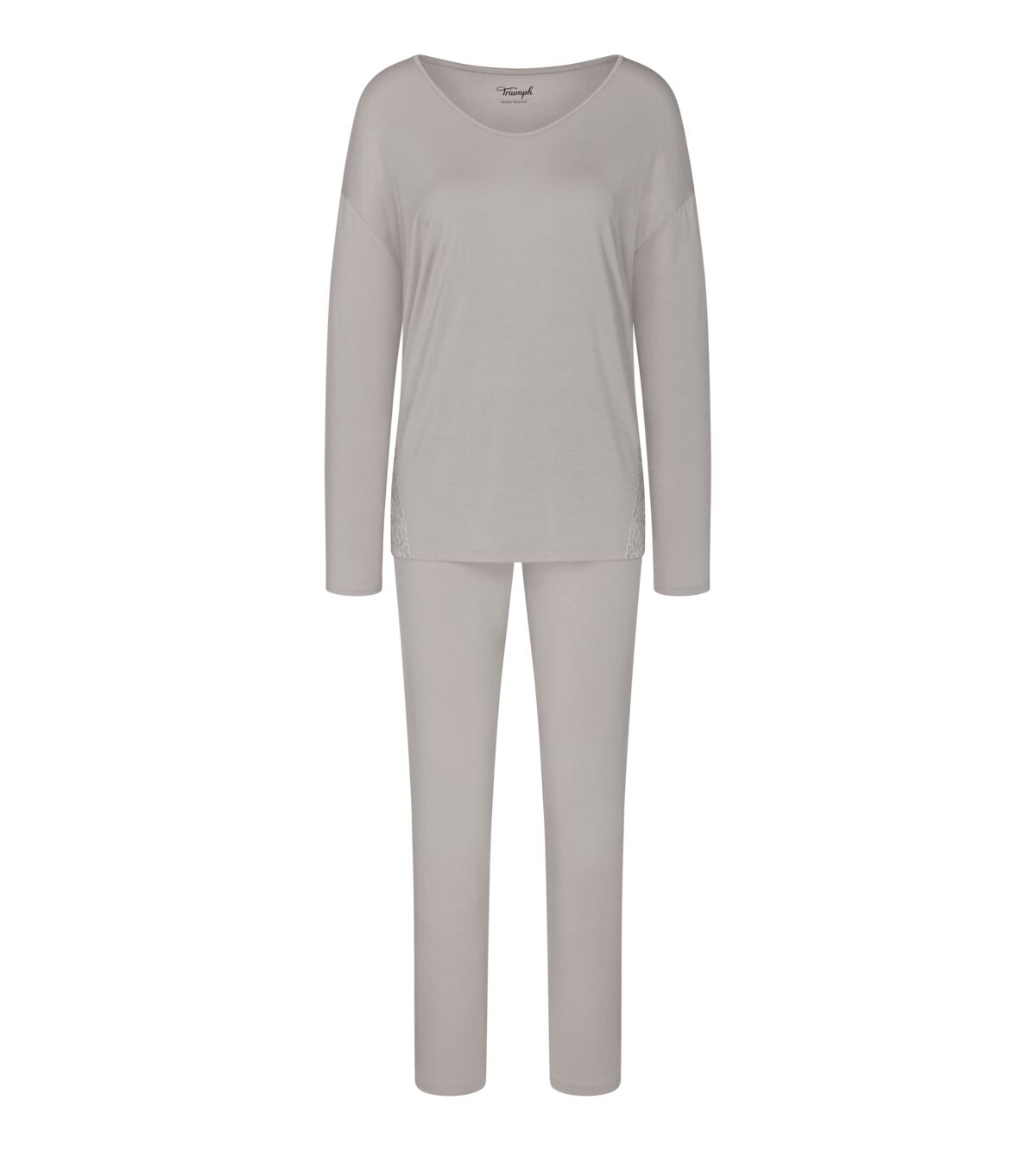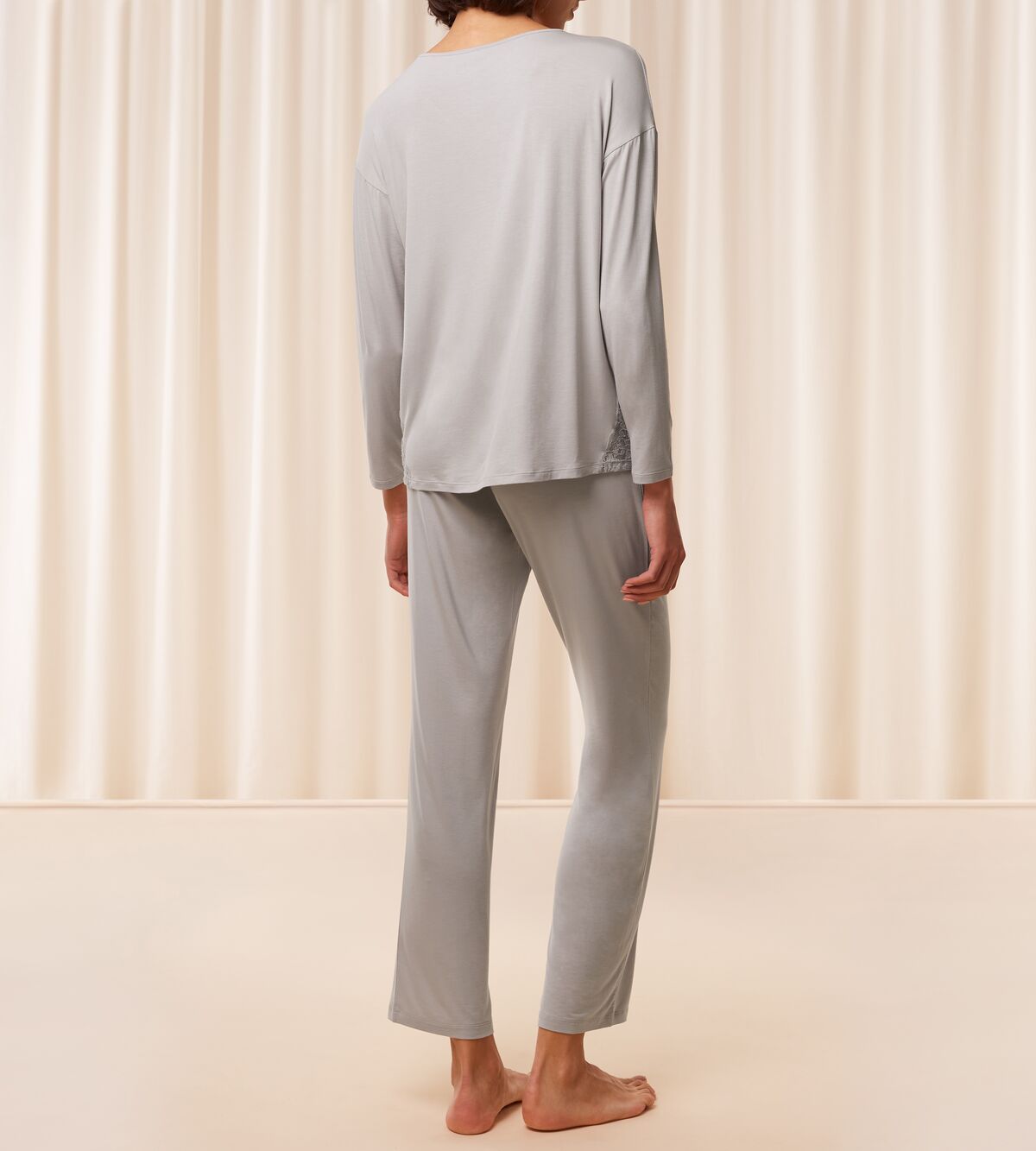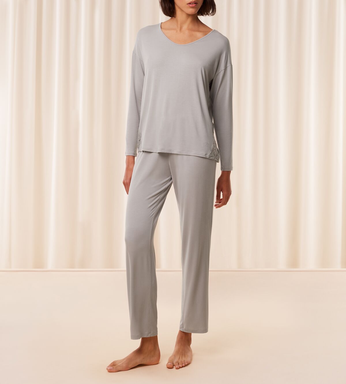 Crafted from 94% certified TENCEL Modal fabric, this full-length pyjama, offers a gentle touch against your skin. The long sleeves and straight-leg long pants are ideal for cooler nights, while the elastic fabric guarantees easy care and a flattering silhouette. Enriched with delicate lace inserts, it strikes the perfect balance between comfort and elegance. Full-length pyjama with comfortable and flattering fit With decorated lace panels Soft-to-the-touch and promotes breathability Easy-care fabric ensures no-iron maintece
