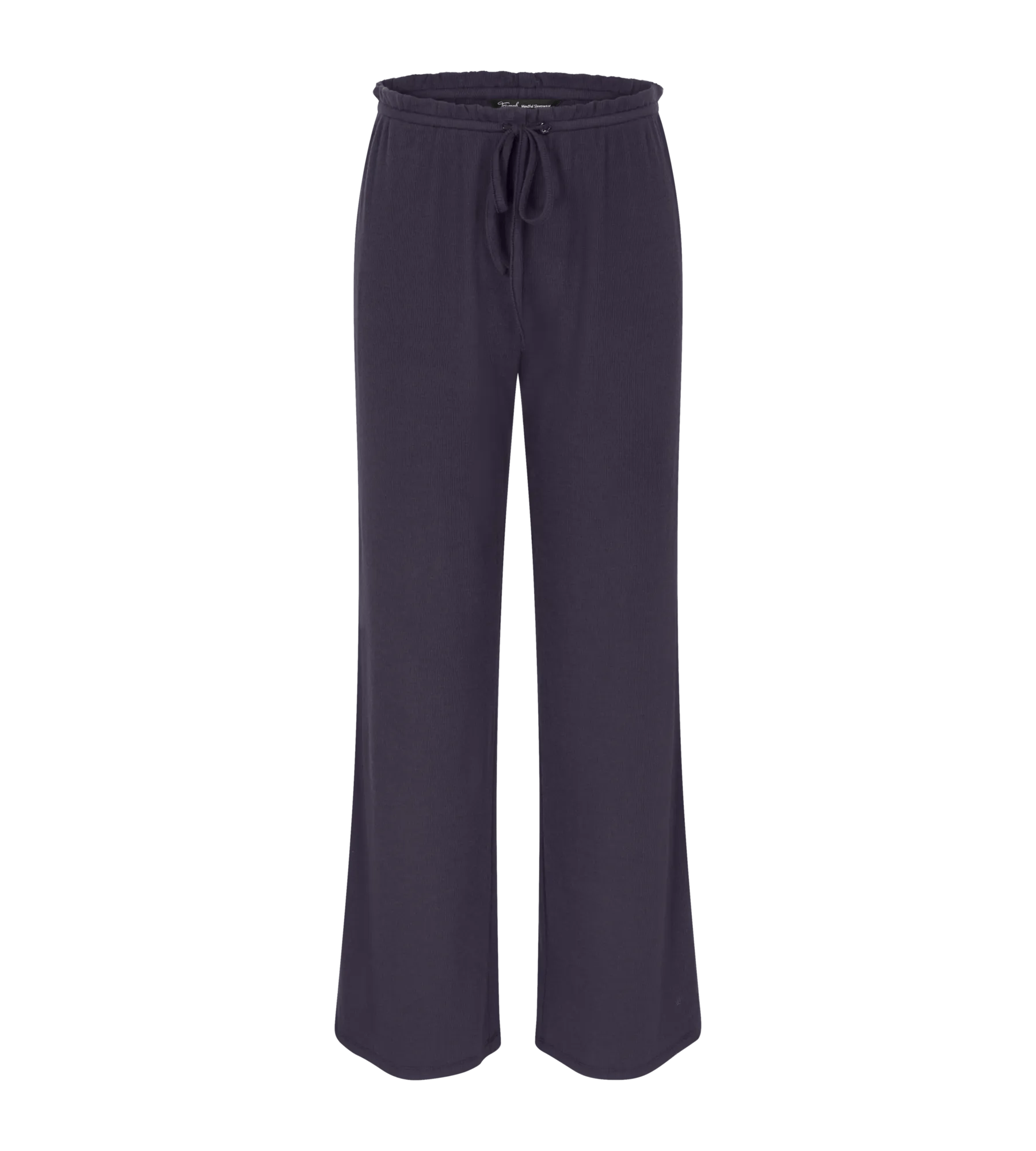 These full-length trousers offer both comfort and style, thanks to its wide-leg silhouette and adjustable, ruffled waistband. Crafted from a soft, brushed-rib fabric blend of 61% Recycled polyester and 33% certified Lenzing Viscose, they provide warmth and cosiness.