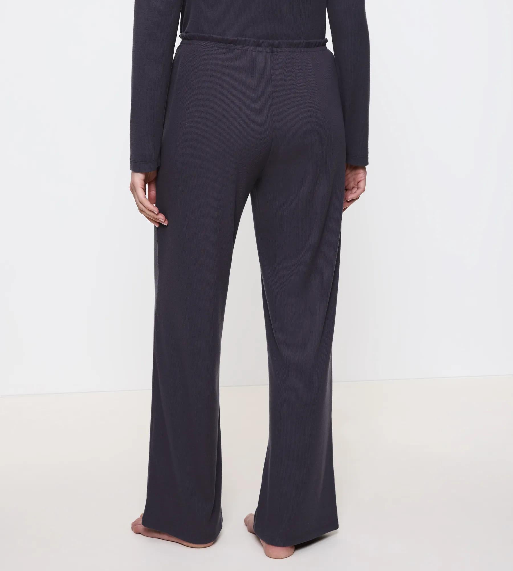 These full-length trousers offer both comfort and style, thanks to its wide-leg silhouette and adjustable, ruffled waistband. Crafted from a soft, brushed-rib fabric blend of 61% Recycled polyester and 33% certified Lenzing Viscose, they provide warmth and cosiness.
