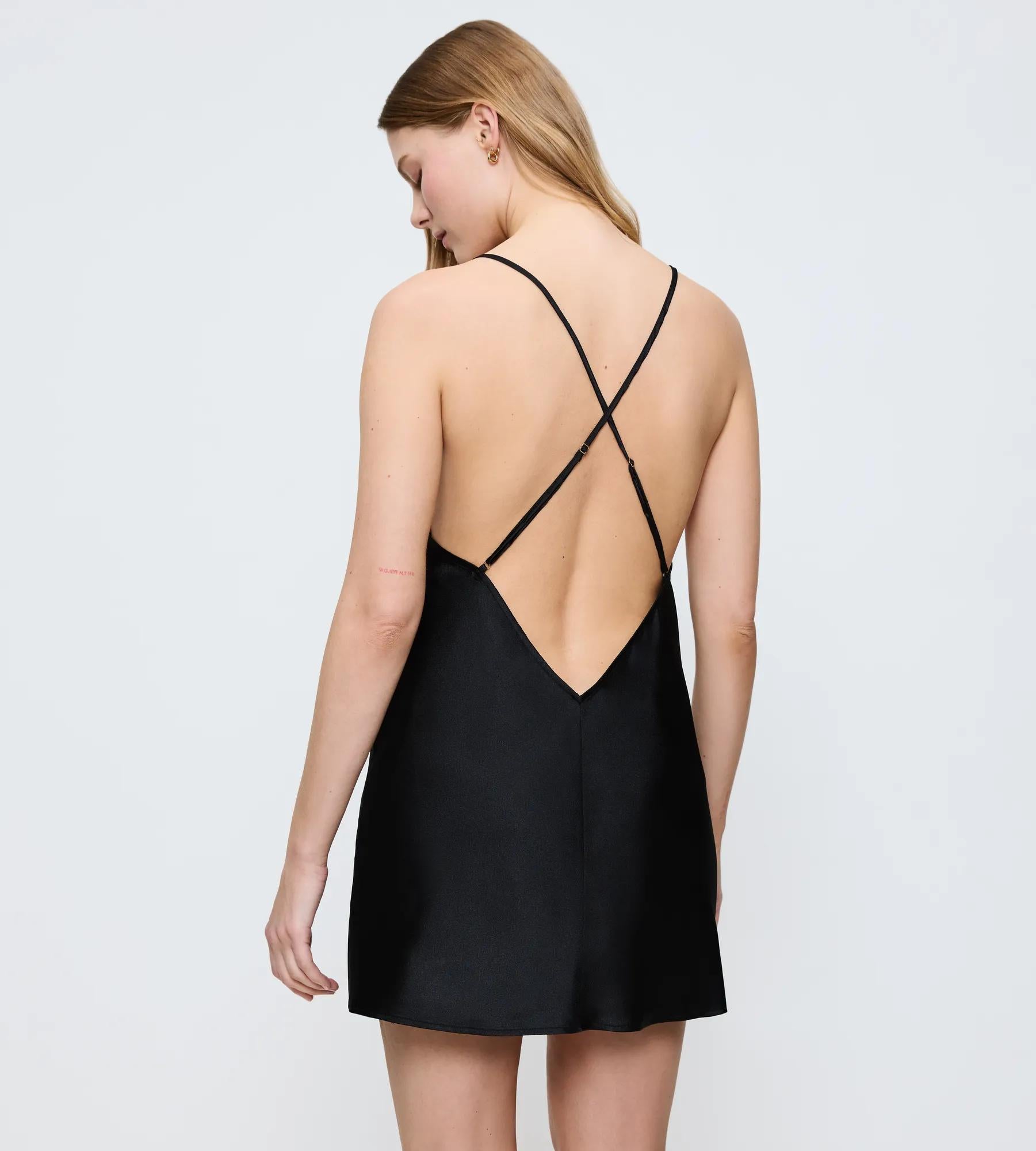 - Spaghetti slip dress with flattering above-the-knee length