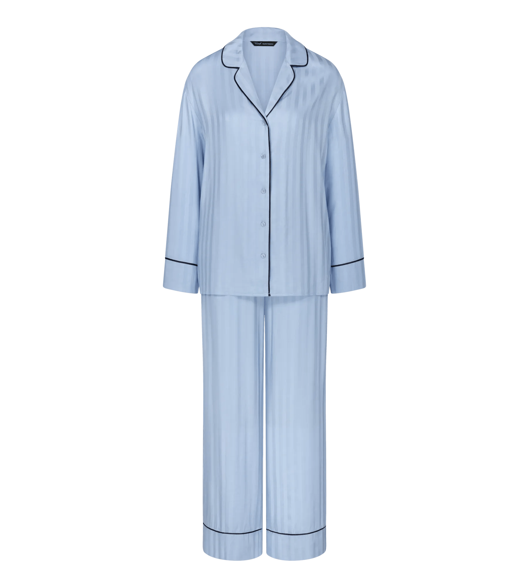 This pyjama set combines comfort with sophistication. The top features a collar and button-down closure, while the full-length pants include convenient side pockets. Sophisticated piping adds a touch of refinement to the overall design. Crafted from soft, fluid, 100% certified Lenzing EcoVero viscose fabric, with a striped shiny and matt Jacquard pattern.