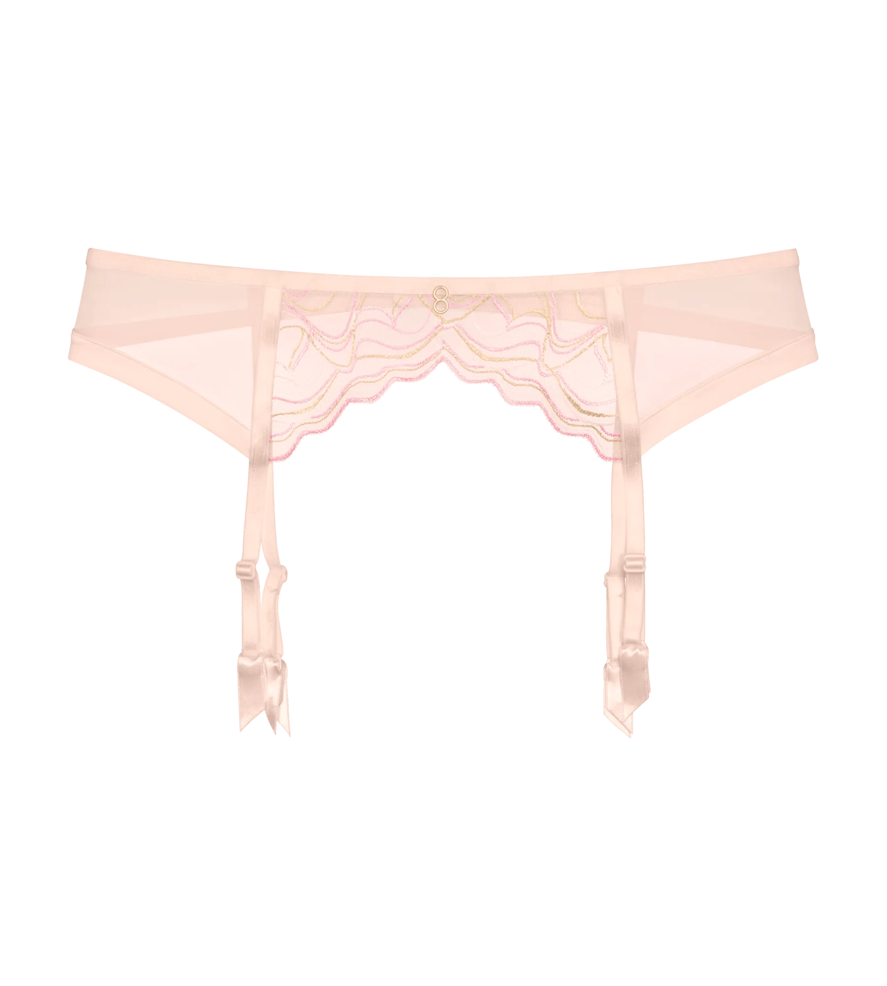 The Palina Waves of Glow Suspender Belt is the epitome of glamour and support, seamlessly blending style and functionality. Crafted from exquisite Italian lace with a subtle shine, this piece exudes elegance and sophistication, enhanced by playful keyhole and ring accents. This sleek design not only completes a refined silhouette but also enhances the waistline beautifully.