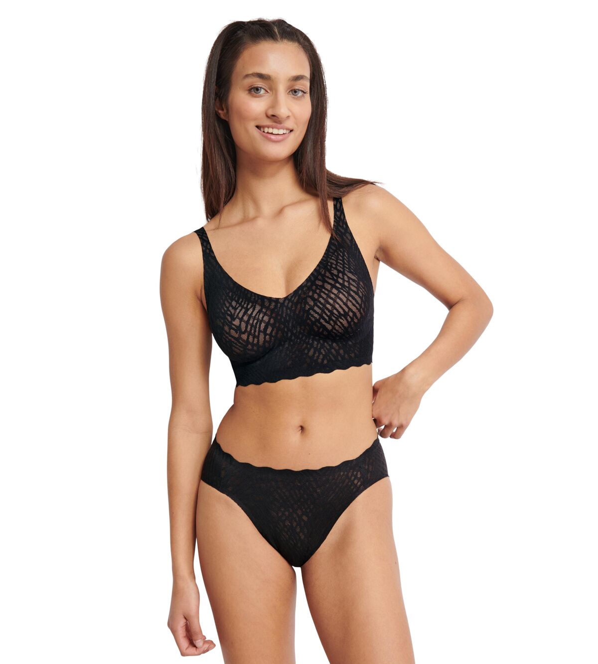 Make every day sheer romance with this ZERO Feel Bliss bralette, offering the seamless, invisible comfort of ZERO Feel in beautiful 360 stretch lace. Removable cookies enhance your silhouette while a free-cut, wavy hem ensures a comfy, curl-free fit. V-neck bralette with removable breathable cookies Medium support Super-soft, breathable, GRS-certified, recycled polyamide 360-degree stretch graphic lace snaps back into shape Delicate, free-cut wavy hem sits flush against skin Completely invisible under tight clothing due to innovative dot bonding technology No wires, no labels, no seams for a second skin feel